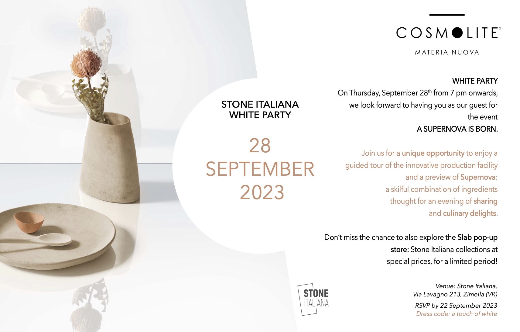 In occasione di Marmomac e Cersaie, lo stabilimento di Stone Italiana a Zimella ha aperto le porte a clienti, fornitori, stampa e istituzioni, in quello che è stato un vero momento di festa, dialogo e condivisione, culminato nell’elegante “White Party”.